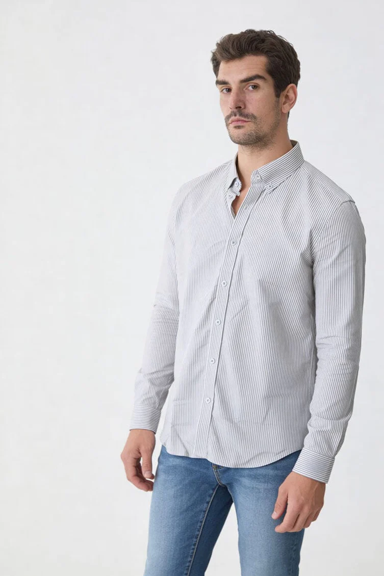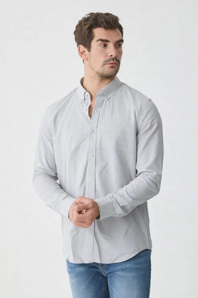 Elevate your everyday wardrobe with this timeless grey striped shirt, designed for both comfort and understated style. Crafted from soft, breathable fabric, it offers a relaxed yet tailored fit that transitions seamlessly from day to night. The subtle stripe pattern adds a refined edge, making it perfect for both casual outings and semi-formal occasions.